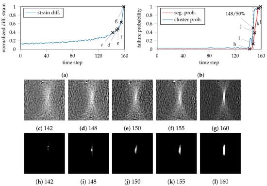 Line profiles for DP800-S050-1 during the forming process and the corresponding probability progression results for the proposed methods on image and pixel scale: (a) Progression of the incremental strain development through the maximum. (b) Corresponding probability progression through the maximum value of the prediction on pixel scale (seg. prob) together with the cluster result on image scale (cluster prob). Especially in case of the image scale approach, the effect of measurement errors or outliers is emphasized by the premature rise of the failure probability that ultimately should remain lower for a couple of more frames. (c–g) Difference strain distributions at multiple time points. (h–l) Corresponding development of the segmented area, or approximated necking region.