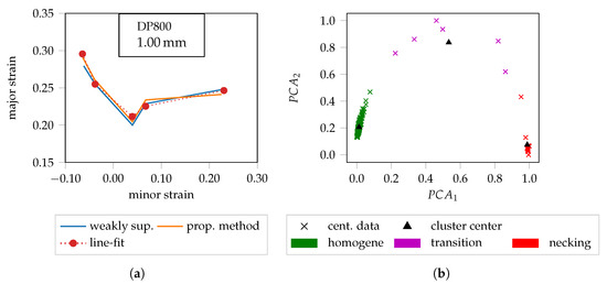 These outliers affect the features in the bottleneck layer, so that individual samples exhibit an increased noise behavior within the clustering procedure. This is illustrated in Figure 7b and especially emphasized by the samples of the transition region. This noise behavior impairs the clustering procedure, so that the cluster centers deviate marginally and thus affect the likelihoods. A comparison of the probabilistic FLC between the weakly supervised and the cluster method based on the encoding path of the proposed method is provided in Figure 7a. Overall, for DP800, a high degree of agreement prevails, with slight deviations for the biaxial loading condition on the right sight of the curve, whereby the differences between the two FLC candidates can be attributed to the varying treatment of the outliers.