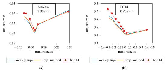 In contrast to the weakly supervised method, the data is now preprocessed using robust scaling. As a result, there is no saturation of the extreme values, so that the necking character is maintained both in the presence and absence of outliers. Consequently, the FLCs of the proposed method deviate marginally from the weakly supervised results (cf. Figure 8a,b). In order to further improve the interpretation of the results, the FLCs determined by the “line-fit” method [6] are also provided in the diagrams. Note that the intersection between the transitions and the necking phase (cf. Figure 1a) is used to generate the FLCs of the proposed method. This corresponds to the 50% quantile of the local necking phase (cf. Figure 6b). To improve visibility, additional quantiles (cf. [17]) are not presented. The 50% quantiles of both machine learning approaches lie below the FLCs of the “line-fit” method for AA6014 and DC04. Conversely, the FLCs for DP800 coincide, so that in this case it can be inferred that the “line-fit” method tends to overestimate the forming capacity as highlighted in Figure 6.