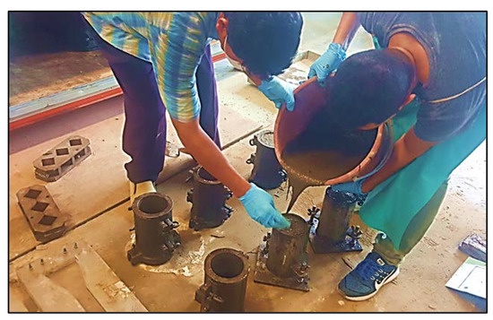 Initially, the solid ingredients comprising of cement, fly ash and fine sand were mixed in a dry state for about 1 min only. Water and superplasticizer were then added to the dry mixture and further mixed for another 4–5 min in a rotating mixer until the blend became consistent and homogeneous. Afterward, silica fume and quartz powder are put together into the mixture and mixed to the required workability. Immediately, the related fibers were gradually and randomly introduced to the mortar mixture while the mixer was still rotating until all the fibers in the ECC mixture were fairly distributed. This phase spanned for another 2–3 min till the fibers were adequately distributed in the ECC mixture. The entire mixing process usually took for about 9 to 12 min. The fresh ECC mixture was cast in 100 mm diameter and 200 mm height of cylinder molds as shown in Figure 1. After 24 h, the specimens were dislodged from the molds and stored in a curing container in the lab at ambient temperature of (23 ± 2) °C.