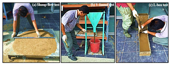 Views of the fresh properties tests: (a) slump flow test, (b) V-funnel test, (c) L-box test.