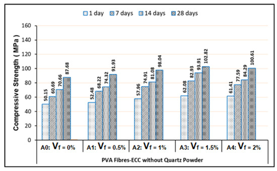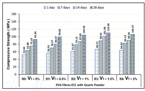 Compressive strength of the PVA fibers-ECC with quartz powder.