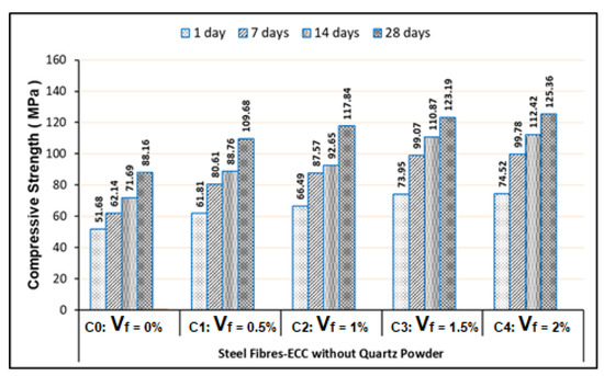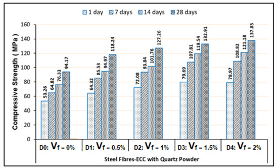 Compressive strength of the steel fibers-ECC with quartz powder.