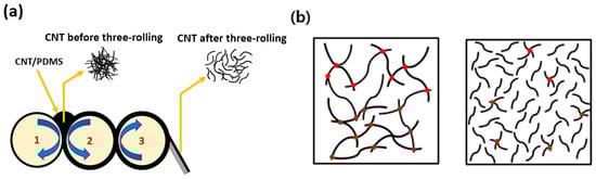 A scheme of (a) a carbon nanotube (CNT) dispersion mechanism during three-roll milling. (b) Morphology of long CNT composite (left) and short CNT composite (right) with the same filler content. Red dots indicate the electrical contact points.