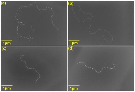 Figure 2 shows the SEM images of the two kinds of MWCNTs. In order to obtain SEM images of a single MWCNT, we physically separated them from the bundles by ultra-sonication. We took enough SEM images to determine the average length of each MWCNT. From Figure 2a,b, we calculated the average length of the longer MWCNT, which was found to be 12 μm with an aspect ratio of 2400. The MWCNT was named the high aspect ratio MWCNT (HCNT). We measured the mean length of the shorter MWCNT in Figure 2c,d and determined it to be 4.5 μm with an aspect ratio of 900. This was named the low aspect ratio MWCNT (LCNT). Furthermore, we found that HCNT is more twisted than LCNT.