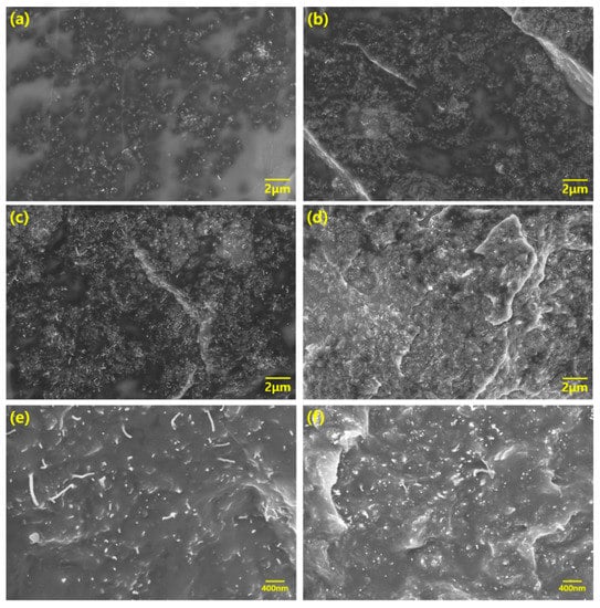 We discerned that high contents of both LCNT/PDMS and HCNT/PDMS are also evenly dispersed in Figure 3c,d. From Figure 3e,f, we observe that the fillers were more densely packed into the HCNT/PDMS composite than into the LCNT/PDMS composite at the same PDMS content. This difference in the density of filler packing is attributed to the longer length of HCNT relative to that of LCNT, which makes HCNT observation more likely.