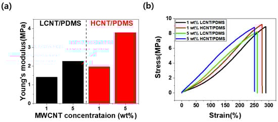 Mechanical properties of MWCNT/PDMS composites: (a) Young’s modulus of LCNT/PDMS composites (black bar) and HCNT/PDMS composites (red bar), (b) strain–stress curve of the 1 and 5 wt% LCNT/PDMS and HCNT/PDMS composites.