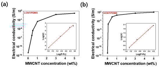 The electrical conductivity of MWCNT/PDMS composites as a function of MWCNT wt% and electrical percolation threshold of MWCNT/PDMS composites. Inset: log-log plot of the conductivity of composites according to the relation (P−Pc): (a) LCNT/PDMS composites case and (b) HCNT/PDMS composites case.