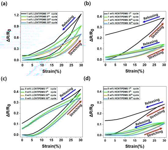 Normalized change in resistance (ΔR/R0) under 20 cycles of continuous tensile deformations to 30% strain: (a) Case of 1 wt% LCNT/PDMS, (b) case of 5 wt% LCNT/PDMS, (c) case of 1 wt% HCNT/PDMS, and (d) case of 5 wt% HCNT/PDMS. (For all samples, 30 pre-discontinuous cycles were executed before the continuous cyclic test).