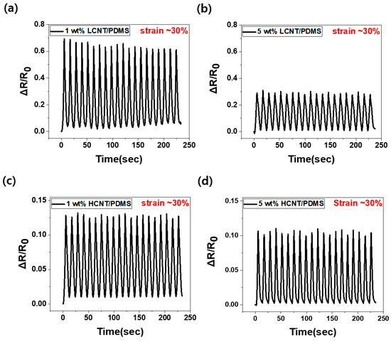 Comparing the relative change in resistance of LCNT/PDMS and HCNT/PDMS, we observed that LCNT/PDMS showed a better piezoresistive effect and stable hysteresis properties after the 1st cycle. The reason for the better piezoresistive properties of LCNT/PDMS is that LCNT is shorter than HCNT, so that the connections between LCNTs are easily broken during tension. Furthermore, the wavy HCNT expanded during tension, thus exhibiting an advantage by maintaining contacts between the HCNTs. According to previous literature, the expansion of the wavy HCNT negatively affects its piezoresistive effect [32,33]. Therefore, a better piezoresistive effect is observed in LCNT/PDMS. In terms of hysteresis properties, LCNT/PDMS shows smaller hysteresis properties than HCNT/PDMS because LCNT has a lower tendency for buckling than HCNT upon release from tensile deformation. Theoretical analyses presented in previous papers confirm this phenomenon [20]. In other words, the electrical paths inside the LCNT/PDMS are less restructured than the electrical paths inside the HCNT/PDMS when released after stretching.