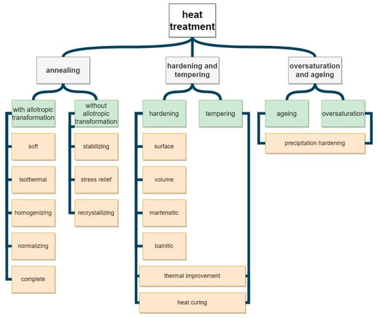 For stainless and austenitic steels, oversaturation is applied. For aluminum forgings, oversaturation and aging are usually performed. In the case of copper alloys, the most frequently applied procedures are oversaturation and aging [16]. In turn, for mono-phase titanium alpha alloys, partial annealing at lower temperatures is implemented as well as full annealing at higher temperatures. For pseudo-alpha alloys, normalization is applied. Diphase titanium alloys can be subjected to normalization as well as aging and tempering. Titanium beta alloys undergo toughening [17]. Interesting research using thermomechanical treatment for TiAl titanium alloy. The canned-forging and subsequent heat treatments of Ti-43Al-4Nb-1.5Mo alloy have been conducted, during which the hot deformation behavior, flow softening mechanism, microstructure evolution, and mechanical properties were investigated [18]. In turn, for magnesium alloy forgings, oversaturation as well as artificial and natural aging are applied. In addition, less often, recrystallization and relief annealing are implemented [19,20,21,22,23]. In the case of nickel alloys, heat treatment is primarily used to shape the properties of carbides prior to putting these alloys into service, ensuring that their desired structures and morphology are obtained. Depending on the chemical composition, requirements for operational properties and anticipated operating conditions, nickel alloys can be subjected to six basic types of heat treatment: normalization, homogenization, stress relief annealing, stress equalization, oversaturation, and precipitation hardening [24].
