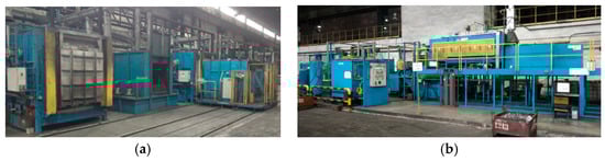 In the implementation of a thermal treatment process, the key device is the furnace in which the process takes place [25,26,27], and as well as conditions of heat exchange [28,29,30,31,32,33]. In this aspect, we distinguish between chamber, tunnel, pusher, and belt furnaces, as well as others, with special constructions and applications [34,35,36,37]. Beside the furnace, the technological line includes additional instrumentation, such as cooling lines [38], quenching tanks, washers, shot blasting machines, feeders, conveyors, trolleys, and platforms [39,40]. The whole stand or line for thermal treatment can be organized in different ways, depending on the needs and possibilities of the forging producer. A popular solution is the application of a chamber furnace, or a few furnaces placed next to each other in one row together with the quenching tanks and washers. The whole is operated by an industrial car, which makes it possible to transport the charge between the particular devices. A characteristic feature of such stands is the operation and treatment of the whole charge, which is placed on one pallet and then heated, cooled, and washed as a whole. This causes certain difficulties connected with the thermal inertia of the system, which is quite hard to heat and even harder to cool at a sufficiently high rate. An example of such a stand has been shown in Figure 2a. Another solution is a technological line in which the product is transported in a continuous manner lengthwise on the platform or the belt. Then, the particular elements of the stand (furnaces, tanks, washers) are placed in one line and connected to conveyors and feeders. In solutions of this kind, each detail (in belt furnaces) or a small portion of the product (in pusher furnaces) undergoes the treatment in an individual manner, which eliminates the effect of collectivity and the problems connected with transporting a large charge. An example of such a solution has been shown in Figure 2b.