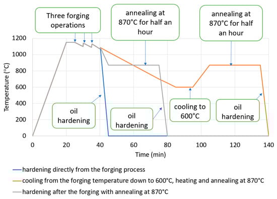 The forgings, after reaching the ambient temperature in a box, are transported to shot blasting and after it go to oil hardening, cooling, and tempering. The duration of the entire production cycle and that forgings are heated twice (during quenching and tempering) should be highlighted, which results in higher energy and refrigerant consumption (oil or polymer). On this basis, as part of the study, a decision was made to try to use heat from the forging process, and then carry out research work for three different heat treatment variants immediately after the forging process. Figure 4 presents the paths of the performed investigations for the following: oil hardening directly from the forging (marked in blue), oil hardening after the forging with special annealing at 870 °C (marked in gray), cooling down from the forging temperature 1200 to 600 °C (temperature below the transformation of perlitic), re-heating and annealing at 870 °C, and the next oil hardening (orange course). For all the three chosen variants, after oil hardening, the tempering treatment was performed (according for this forging). The assumed levels of temperatures were determined based off of the analysis for this material, i.e., steel C45, as well as the carried out investigations. For C45 steel, the perlitic transformation with free cooling takes place at about 660 °C (therefore, the forgings were cooled down to 600 °C), while the temperature of austenitization is in level of 860–880 °C.
