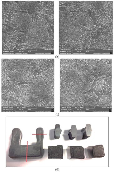 SEM scanning microscopic analysis after three proposed treatment variants (hardening) directly after the forging process: (a) technology I, (b) technology II, (c) technology III, and (d) the places of the metallographic specimens was sampled.
