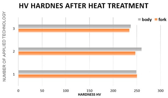 You can see from the measurement results (Figure 5), basically regardless of the heat treatment variant used (from the proposed ones), the hardness values are in the range of 235–255 HV. Such values are also within the range according to the recipient’s requirements. Therefore, it can be concluded that the proposed heat treatment variants carried out directly from the forging process do not have a negative impact on both the microstructure and the hardness of the forgings obtained after separate/independent heat treatment. It seems that hardening directly from the forging temperature is possible, but from a technological point of view, it is unjustified. The high hardening stress generated can cause product deformation and/or cracking during the cooling process.