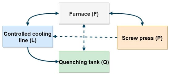 The concept of the prototype line is based on any (depending on the requirements of the developed thermal processing technology) arrangement of four key devices: mechanical press for hot and hot forging (P), controlled cooling line (L), chamber furnace for heating the charge/forgings (F), and oil/polymer hardening baths (Q). Thanks to this, through any configuration of devices, it will be possible to perform any thermoplastic treatment, including, e.g., both normalization and quenching (Figure 7). With the right selection of these key devices, it is possible to simulate almost any heat treatment process, both as a separate one and immediately after the forging process (Figure 8).