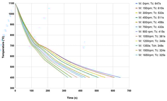 Separate heating was used for each sample because of the possibility of scale formation in the case of repeated heating of the same element. Each test consisted of heating the sample material in an oven to a temperature just above 1100 °C and then subjecting it to a controlled cooling process to about 400 °C on a controlled cooling line. In addition, to analyze the impact of fan speeds, a different fan speed was used for each sample in a given series (dimensions and material), which was changed by 5 Hz using a frequency converter in the range from 0 Hz (which was 0 rpm) to 55 Hz (which was respectively 1650 rpm) for maximum fan speed. The belt speed for all measurements was constant at around 2 m/min. Preliminary tests showed that the change in belt speed had no significant effect on the sample cooling rate. The value of the belt speed was adopted in such a way that for the switched off fans, a single sample was cooled from the forging temperature from 400 °C. During each process, the temperature of the middle of the sample was recorded using a K-type thermocouple with a diameter of 1.2 mm. During each test, the cooling time was measured as the difference between the time when the sample with the forging temperature of 1100 °C reached 400 °C. In Figure 9 and Figure 10, the cooling processes for both materials (with dimensions 35 × 40 mm) were discussed.