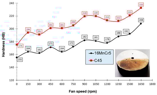 Figure 11 presents the distribution for hardness measurements (as the average of three measurement points) for both materials: 16MnCr5 and C45 as a function of fan speed for samples with dimensions 35 × 20 mm, as mechanical properties.