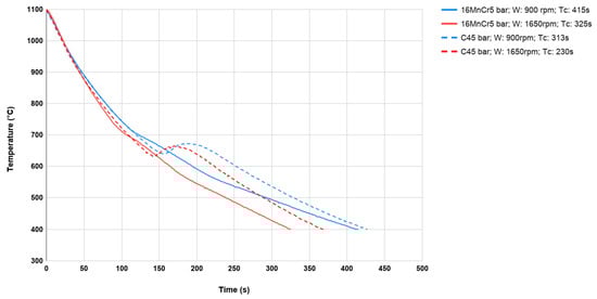 The cooling curves of 16MnCr5 and C45 samples with the dimensions ⌀35 × 20 mm with the ventilator speed of 900 rpm and 1650 rpm from forging temperature 1100 °C to 400 °C.