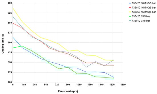 To be able to optimize the times of designed thermal treatments, which are important in terms of the production time, based on the collected data and measured cooling times as well as the dependence of cooling times on temperature, a fan speed diagram was developed (Figure 13). For example, the characteristics for the sample with dimensions ⌀35 × 40 mm made of C45 (Figure 13–light cyan line) were determined based on the times measured for a series of 12 such bars, with different speeds of fans (Figure 10).