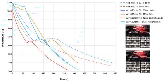 As can be seen in Figure 14, for cooling forgings on an industrial BY line from forging temperature 1100 °C to 400 °C, the cooling time is about 600 s. While for a prototype line for controlled cooling, with maximum fan efficiency (1650 rpm), the cooling time was reduced by almost half to about 360 s. On the other hand, the difference between the measuring points (fork and body) is about 50 °C. In addition, the cooling time from forging temperature to 400 °C for a single forging placed between the remaining forgings increased by about 90 s.