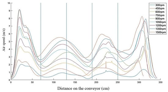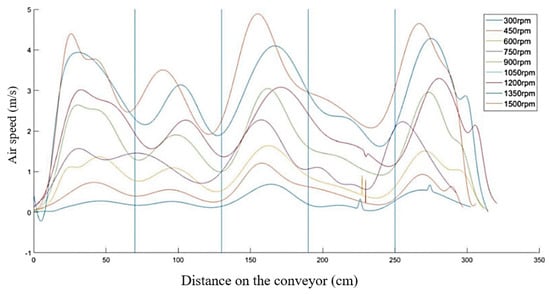Distribution of the air flow speed in the scope of 300–1500 rpm along the conveyor belt shift axis (axis X); vertical lines: ventilators axes.