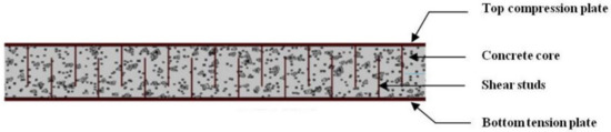 Generally, SCS consists of a layer of unreinforced concrete core, sandwiched between two relatively thin steel plates (top compression plate and bottom tension plate), that are connected to the concrete infill through welded shear stud connectors (Figure 1).
