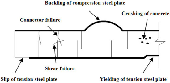 Traditional reinforced concrete elements may be failed due to crushing of concrete. Yielding of steel may be under flexure, shear and torsion or due to bond failure. Likewise, in SCS elements also the collapse may be triggered because of any one mode like, yielding of steel in tension, yielding or buckling of steel in compression, crushing of concrete in compression, tension steel slip, shear failure of concrete or failure of shear studs [8]. In these, yielding of steel in tension or compression and the crushing of concrete in compression are governed by the choice of the appropriate material and their physical properties. Some of the significant failure modes of SCS element are illustrated in Figure 2.