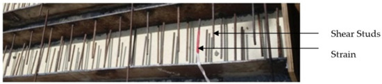 Since this is a pilot and an initial stage study, it was attempted to use conventional steel bars without head for two points. One is to use the conventional steel bar as shear stud connectors to make a simple process to get shear connectors like normal bar cutting for the ready use at the site. Second one is to get the results data for its performance compared to shear studs with head in future. Therefore, the geometry of the shear connectors used in this study was only conventional steel bars (diameter and length) cut into required length and used and not made any complicated geometry like normal shear studs or connectors. Shear connectors in the form of studs without a head were welded. of Eight millimeter-shank-diameter and 165-mm-high Fe 415-grade studs were used as the shear studs. Stud-spacing of 150 mm and cover of 25 mm were maintained as shown in Figure 4.
