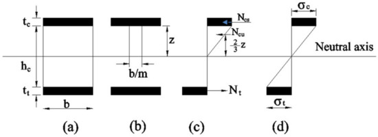 Sectional details for flexural resistance of SCS beam. (a) Section of (SCS) beam; (b) Equivalent section; (c) Compressive and tensile forces distribution (d) Idealized stress distribution