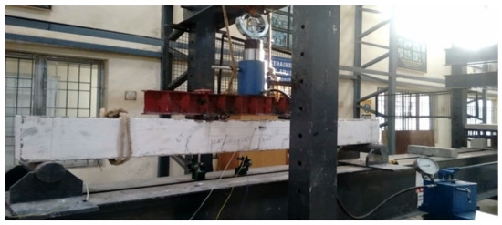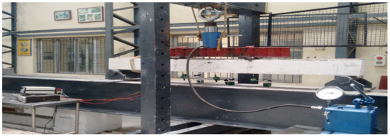 For the plate, 4-mm, 6-mm and 8-mm CC, CCQ, CSC and CSCQ, mixed used beams were tested under a two-point load. Totally 12 beams were tested. All the beams were white cemented over concrete surfaces except the plates for marking the positions of supports, load points, dial gauges (TMC Associates, Chennai, India) and linear voltage displacement transducer (LVDT) (Aimil, Chennai, India). Beam to be tested was lifted and positioned in the loading frame. Level tube was used for the orientation of the beam position before testing. Simple supports were provided at either side with the bearing of 100 mm hence the effective span of the beam fixed as 2200 mm. Ten-millimeter length electrical strain gauge TML (Tokyo Measuring Instruments Lab, Tokyo, Japan) (resistance of strain gauge was 120 Ω) was used to measure the strains developed at the center of tension plate and compression plate and at the center of concrete depth of beam. All the strain gauges were connected to the 10 channel data logger. An LVDT and dial gauge were used at quarter span of beam specimen on either side at bottom and at the center of beam bottom to measure deflection. With these set up, a spreader beam of required size was placed over the beam to distribute the load at the middle third points of the beam. Proving ring was placed over the hydraulic jack capacity 50 T placed over the spreader beam. Now the beam specimen was made ready for testing with the entire set up. A schematic diagram of beam test setup is shown in Figure 6. A typical experimental set up is shown in Figure 7.