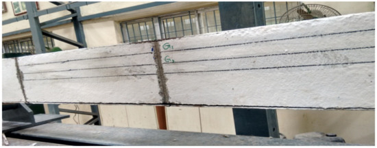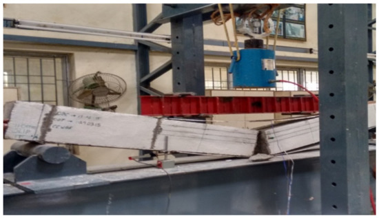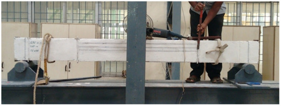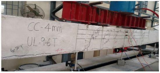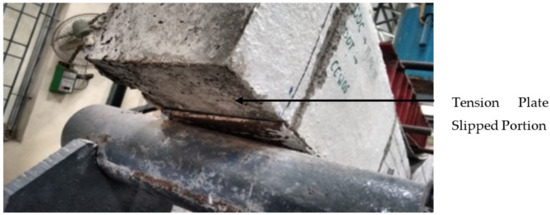 However, with the debonded plate flexural test was continued on the beam. In continuation of the load applied, debonding of plates extended and the slip of the tension plate has taken place near the support as shown in Figure 10. Once the slip of the tension plate occurs, the concrete element fails suddenly in a brittle manner at the flexural zone as shown in Figure 11. In all cases of CC, CCQ, CSC and CSCQ beam elements the ultimate load was observed to be 9.81 kN and all the specimens were failed at the flexure zone. The bottom tension plate slip was measured in range of 100–110 mm. Since all the specimens slipped and failed suddenly as expected, for safety consideration of the instrument and the person, the central deflection and strain measurements on steel plates and concrete were not taken in this typical study.
