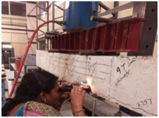 Double skin SCS beam element without shear studs was lifted and placed in the loading frame. Since shear studs were not provided gauge rods were not removed until testing was started to maintain the integrity between the steel plates and the core concrete. Just before the start of the test, gauge rods were removed in a gentle manner as shown in Figure 8. It was noticed and observed that the debonding of both tension and compression steel plates were started while grinding to remove the gauge rod itself and it is shown in Figure 9.