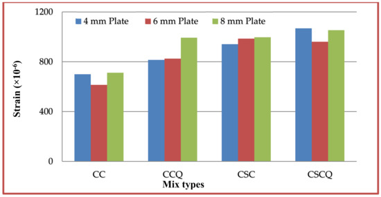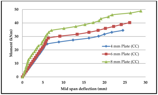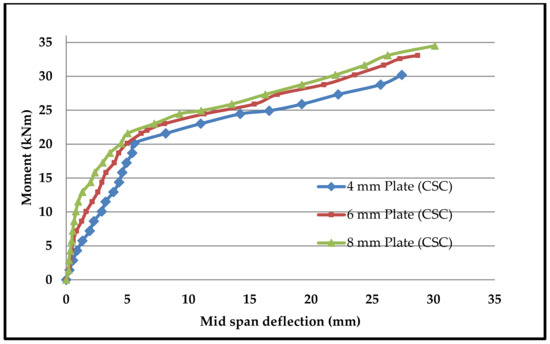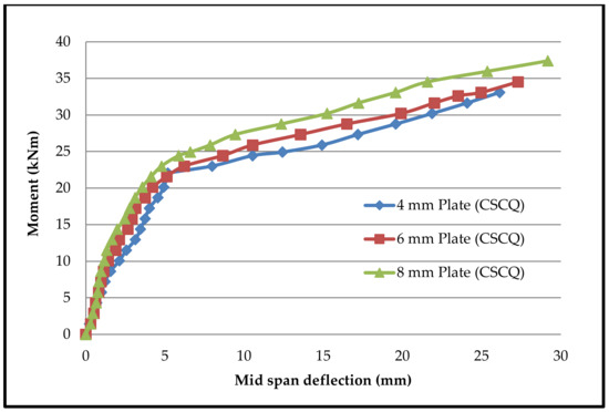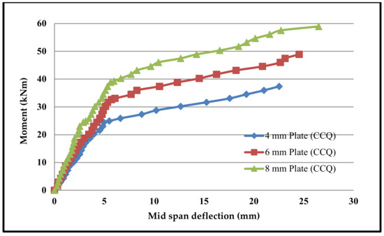 There should not be any excessive cracking to state that the structural element performs satisfactorily. If the cracks are wide then it will allow ingress of any harmful substances into that element. Excessive cracks may also look unsightly and cause concern to the users. Therefore, various standards recommended that the maximum crack widths should lie within the range between 0.1 to 0.4 mm on different exposure conditions [16]. The standards—both IS 456:2000 [25] and BS 8110 [26] guidelines—state that the surface crack width should be limited to 0.3 mm. However, this guideline value is pertaining to conventional reinforced concrete structures. However, this crack width recommendation is suggested for the durability aspect and hence the same was considered for this SCS beam study also. Considering in light of this, all the SCS beams tested exhibited the crack widths at yielding were well below that guideline value stipulated in IS 456:2000 [25] and BS 8110 [26] for durability aspect. The average spacing of cracks of 4-mm, 6-mm and 8-mm plate used beams were between 218–230, 137–206, 149–198 and 143–173 mm for the mixes CC, CCQ, CSC and CSCQ, respectively.