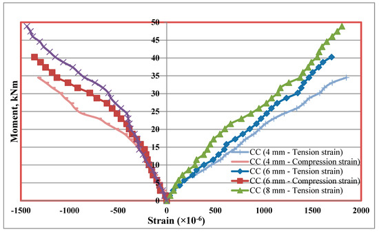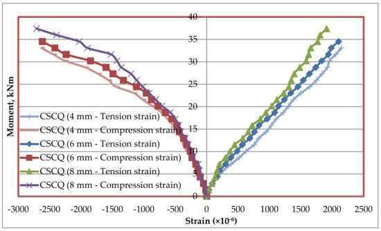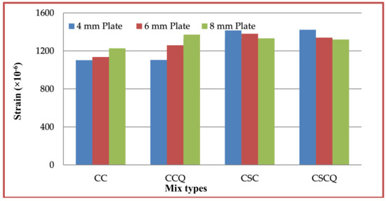 From Figure 23, it can be seen that, as the thickness of plates increases strain also increases in CC and CCQ mixes. In general, for a particular concrete strength if the cross sectional area of steel increases strain may be less for a particular level of load applied. However, in this study the load applied until the beam’s ultimate capacity. Therefore, the strains are more when the thickness of plate increases as the moment capacity also increases. It shows that the use of CC in SCS beam elements behave typically. At the same time, this trend was reversed in case of CSC and CSCQ mixes used SCS beams. The possible reason for this trend is that the moment carrying capacity of CSC and CSCQ beams are less compared to CC and CCQ mixes. However, in case of compression plates strain (Figure 24) neither the CC and CCQ mixes nor the CSC and CSCQ mixes trends do not happen as in the case of bottom tension plate strains. The possible reason for this there may be an influence of strain due concrete uncertainty (though the concrete is strong in compression, it is generally heterogeneous in nature). However, further research is needed to find the proper reason to get better conclusion on this.