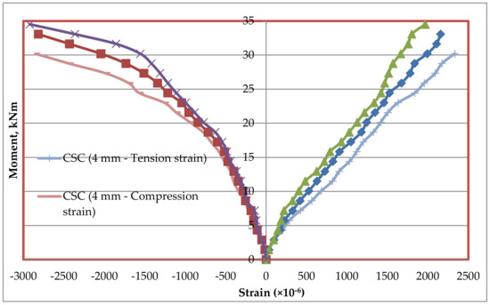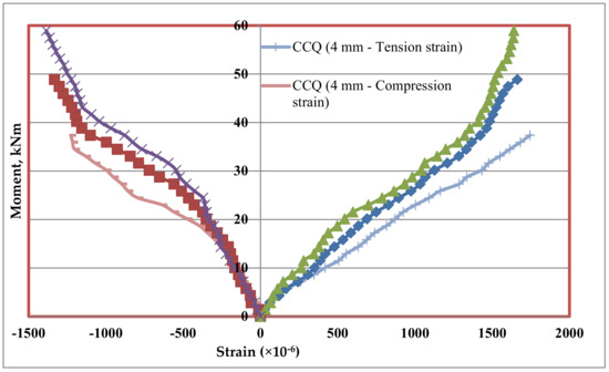 Strains at bottom tension and top compression plates were measured for every increment of load applied. The strain distributions of bottom tension plate and top compression plate for all the mixes CC, CCQ, CSC and CSCQ are shown in Figure 19, Figure 20, Figure 21 and Figure 22, respectively. Results of tension and compression steel plates’ strain of tested beams at yielding is presented in Table 8.
