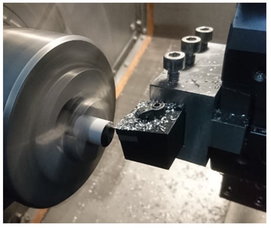 The machining process was carried out on an AFM TAE 35 lathe (AFM DEFUM S.A., Andrychów, Poland). The CNMG 1204 08-SMR 1105 inserts made of tungsten carbide (WC) with PVD (Ti,Al)N2 coating intended for machining of difficult-to-cut materials were used. Recommendations for applications of cutting inserts manufacturer for hardly machinable (S) materials were followed. The basic parameters of the insert are listed in Table 2. The cutting process is shown in Figure 1.