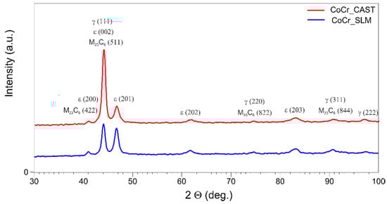 The analysis of the phase composition by X-ray diffraction showed that both tested CoCr alloys (diversified in terms of fabrication method) have a similar phase composition. In both cases the dominant phase was γ-Co characterized by fcc (face centered cubic). Moreover, hcp (hexagonal close-packed) structure also was detected. This was due to the martensite transformation from the γ phase to the ε phase during the cooling process [,,]. The visible difference in the intensity ratio of the highest γ and ε peaks for SLM sample may be due to the very rapid cooling during manufacturing process. Therefore, incomplete γ-ε phase transformation has occurred, which is clearly visible in the case of ε (201) peak, whose intensity is only slightly lower than γ (111). The additional phase consisting of M23C6 carbides ((M = Cr, Co, Mo) has also been identified, which stays in agreement with [,].