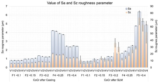 Comparison of Sa and Sz surface roughness parameters obtained for tested CoCr alloys and different f values.