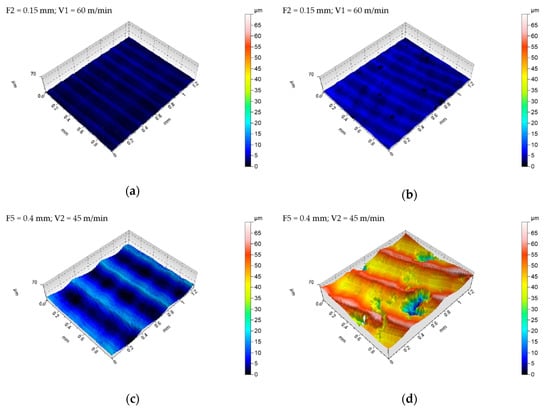 Isometric views of the surfaces machined with different technological parameters, i.e., F2 = 0.15 mm; V1 = 60 m/min and F5 = 0.4 mm; V2 = 45 m/min for: (a,c) cast sample; (b,d) SLM sample.