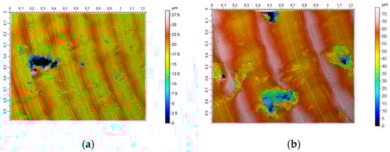 Surface isometric images of the samples after casting (Figure 7a) and SLM process (Figure 7b) confirm the observations regarding the GPS parameters (Figure 5 and Figure 6). Just as no significant quantitative differences were found for the GPS parameters determined, the similar nature of machined surfaces at low feed rates is noticeable (Figure 6). Thus, it can be argued that casts and samples fused with a laser beam have comparable machinability at low feed rates. However, considering the higher feed values (F3, F4, and F5), the characteristics of both GPS parameters and surface isometric images, in particular of SLM samples, are more diverse. The intensity of occurrence and the size of the observed defects on the surface increased with increasing feed value—Figure 8.