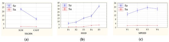 Changes in Sa and Sz parameters under the influence of main effects, where error bars indicate 95% confidence interval for the factor: (a) type of prefabricated element used—TECH, (b) feed speed—FEED; (c) cutting speed—SPEED.