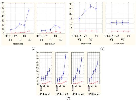 Significant interactions affecting the values of Sa and Sz parameters determined using multivariate ANOVA analysis where: (a) the impact of interaction between the semi-finished product technology and feed (TECH × FEED), (b) technology and cutting speed (TECH × SPEED) and (c) feed and cutting speed (FEED × SPEED).