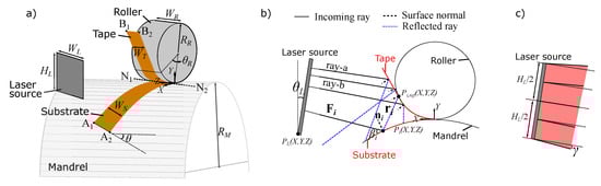 A parametric 3D optical model based on the ray-tracing approach was developed for LATP and LATW processes using an in-house code written in MATLAB. A schematic view of the model geometry is seen in Figure 2a. A global coordinate system denoted as and Z was used in the optical model. Here, and were the roller width and radius, respectively, and were the width and height of the laser source defined as a plane, respectively. A top-hat laser power distribution with a divergence angle of was considered [30]. The winding/placement angle , the substrate width and the tape width were assumed to be constant during the manufacturing process.