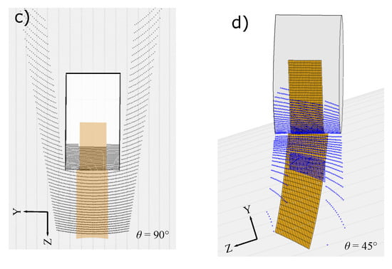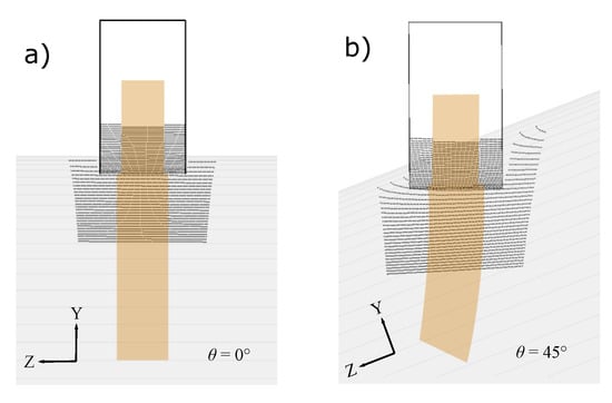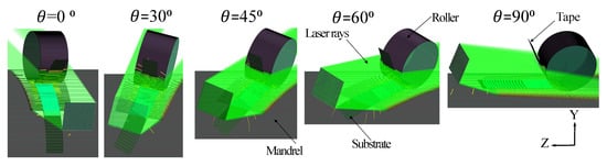 A representation of the simulation model showing the placement angles of 0°, 30°, 45°, 60°and 90° is shown in Figure 3. In all cases, the relative orientation and location of the laser cross-section plane toward the nip-point were remained constant. However, the relative locations of the points on substrate toward the laser plane were changed due to the curvature. This effect can strongly change the absorbed energy intensity and the process temperature as a result of changes in the irradiated area and the irradiation angle. The intersection points of incoming rays with the 3D surfaces for , and are illustrated in Figure 4a–c, respectively. It is seen that the curvature of the mandrel and the laser divergence were taken into account in the developed model. The corresponding intersection points of the reflected rays with substrate, tape, mandrel and roller are shown in Figure 4d for , as an example. The incoming rays were assumed to reflect specularly in the current model for the sake of simplicity (ease of analysis) and computational time.