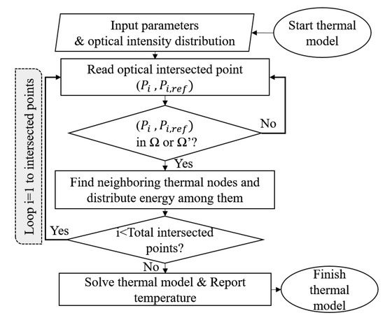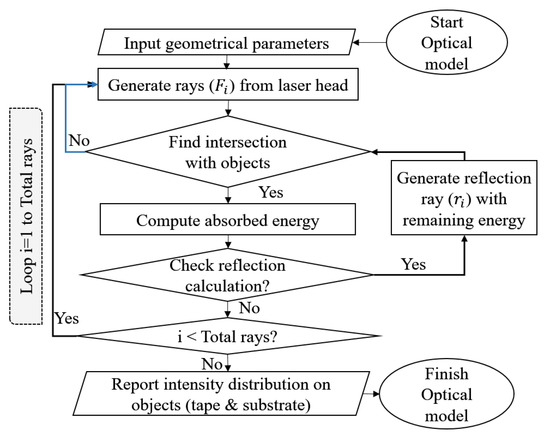 where was the fraction of total energy calculated by using the unpolarized Fresnel equations [22,31] and was the refractive index. Similarly, the absorption of the reflected energy at point was calculated using . This approach was successively continued for the total number of rays and reflections until all intersection points of the incoming rays and corresponding energy were calculated. Note that only one reflection was considered in the optical model because the energy carried by the second and following reflected rays were estimated as less than 5% of the energy of the incoming ray [26]. The total number of rays used in the optical model was 32 k (160 along the width and 200 along the height of the laser source plane). The flowchart of the described optical model is represented in Figure 5.