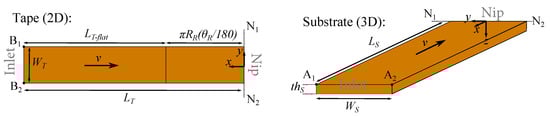 A local thermal model was developed by employing the control volume based finite difference technique in order to predict the temperature distribution prior to the nip line (N1-N2 in Figure 2a). The generic tape and substrate geometries defined in the optical model were unfolded to the computational domains in the thermal model as shown in Figure 6. A local coordinate system denoted as and z was employed in the thermal model. A structured control volume based mesh was therefore defined in the local () coordinate system. The thickness of the incoming tape is usually very thin as compared to the substrate thickness which yields a uniform temperature distribution in the through-thickness direction for the tape. Therefore, 2D and 3D heat conduction models were considered for generic purposes for the tape and substrate, respectively. The advection term in the heat transfer equation was implemented using a Eulerian frame work. The corresponding governing equations given in Equations (6) and (7) for the tape and substrate, respectively, were solved using an upwind implicit scheme as described in Reference [32].