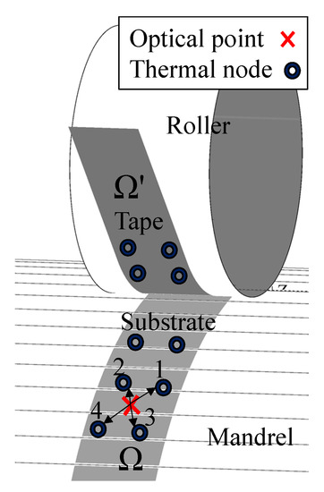 Since the number of rays defined in the optical model was larger than the control volumes defined on the tape and substrate surface (at ), a mapping procedure was defined in order to translate the laser irradiation from optical points to the control volumes in the thermal model. The energy of each incoming ray defined in the optical model was distributed among the four closest control volumes in the thermal model based on the distance between the intersection point of the ray and corresponding control volume using the expression in Equations (20) and (21):