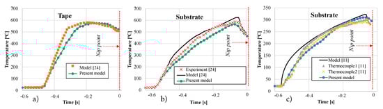 Tape (a) and substrate (b,c) temperature results from Reference [11,24] and corresponding results from the developed present simulation model. The temperature of a particle through the time from laser irradiation until nip point is shown.