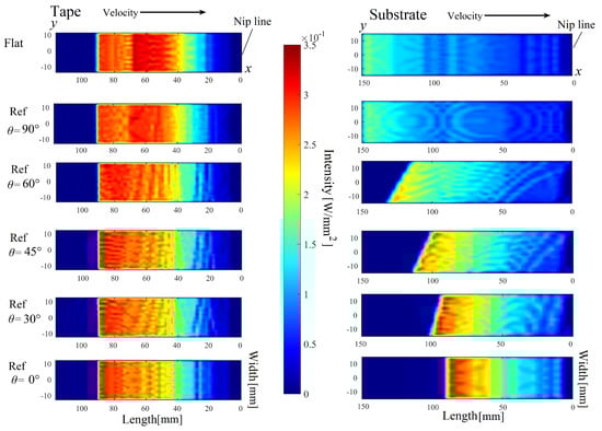The main outcome of the 3D optical model was the absorbed power intensity distribution on the tape and substrate. The obtained distributions for the cases Flat and Ref using different are shown in Figure 10 by unfolding the respective 3D surfaces into 2D ones. The slight scatter in the intensity distribution in Figure 10 was mainly due to the utilized finite number of laser rays that originated from the discretized laser source. Nevertheless, the sufficient number of rays were used in the optical model which provided converged temperature output in the thermal model in which the finite difference method was employed. It is seen in Figure 10 that the intensity distributions on the tape surfaces were almost identical for different winding/placement configurations which was as expected because the laser orientation was in parallel with the tape and the tape geometry remained constant for all simulations. The slight differences, for example, for , were due to the reflections from the substrate. The total irradiation length of the tape was approximately 60 mm and the region 20 mm prior to the nip line was not heated, that is, the so-called shadow area, due to the curvature of the tape that is in contact with the roller as seen in Figure 2. The effect of the mandrel curvature on the intensity distribution was found to be more significant for the substrate. A more non-uniform and non-symmetric intensity distribution was predicted especially for due to more complex laser irradiation and reflections. The shadow region for the substrate was found to occupy a smaller area as compared with the shadow regions for the tape. In addition, the reflections coming from the roller as well as the laser divergence also played a role on the intensity distribution on the substrate as can be understood from the slight reduction in the intensity magnitude at the edges, that is, at mm and mm (see Figure 10). The length of the heated region reduced approximately from 140 mm to 75 mm as reduced from 90 to 0, as expected from Figure 4. On the other hand the magnitude of the intensity increased with a decrease in due to an increase in the incident angle . The effect of the laser divergence angle can be seen for Flat and Ref-90 cases in which the laser intensity magnitude was slightly smaller near the nip line region than the region far away from the nip line. A gradual decrease in the intensity magnitude was found towards the nip line for mainly due to a decrease in . The reflections on the substrate surface coming from the tape and roller were also visible, for example, the region approximately 50–60 mm away from the nip line for Flat and Ref-90 cases. The maximum laser intensity value on the substrate was calculated as 0.35 W/mm for .